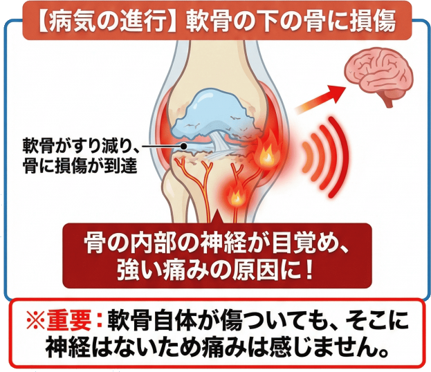 さらに変形が進み、軟骨が大きくすり減ってしまうと、軟骨の下にある「骨にまで損傷が達してしまいます」。この状態になると、痛みの司令塔はさらに奥へと移動します 。