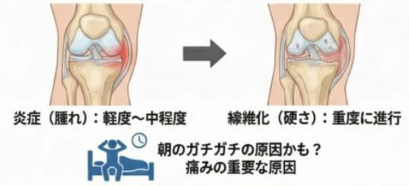 この事実は、症状が進んだ膝痛の場合、組織が硬くなることが、関節の動かしにくさ(こわばり)を引き起こし、単なる炎症よりも、硬くなることが、痛みの重要な原因である可能性があることを示しています。あなたの膝が朝、特にガチガチに硬く感じるのは、この組織の硬さが原因かもしれません。