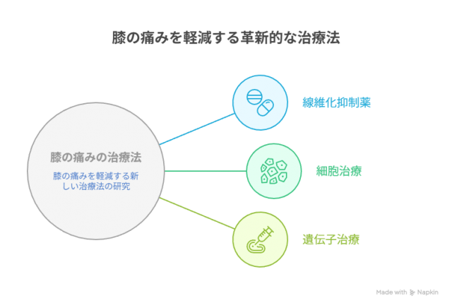 現在の進行した重度の変形性膝関節症の治療は、痛み止めやシップなどで、症状を抑えることが中心です。しかし、この研究が示すように、「硬さ(線維化)」が重要な問題だとわかれば、「硬くなった組織を柔らかくする」ことを目標にした、全く新しい種類のお薬や治療法が今後開発される可能性があります。これは、将来の膝痛治療に大きな希望をもたらします。