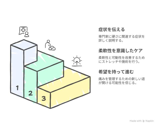 - 柔軟性を意識したケアを: 専門家の指導のもと、硬くなった関節周辺の組織を優しくほぐし、柔軟性や可動性を改善するストレッチや施術を継続しましょう。