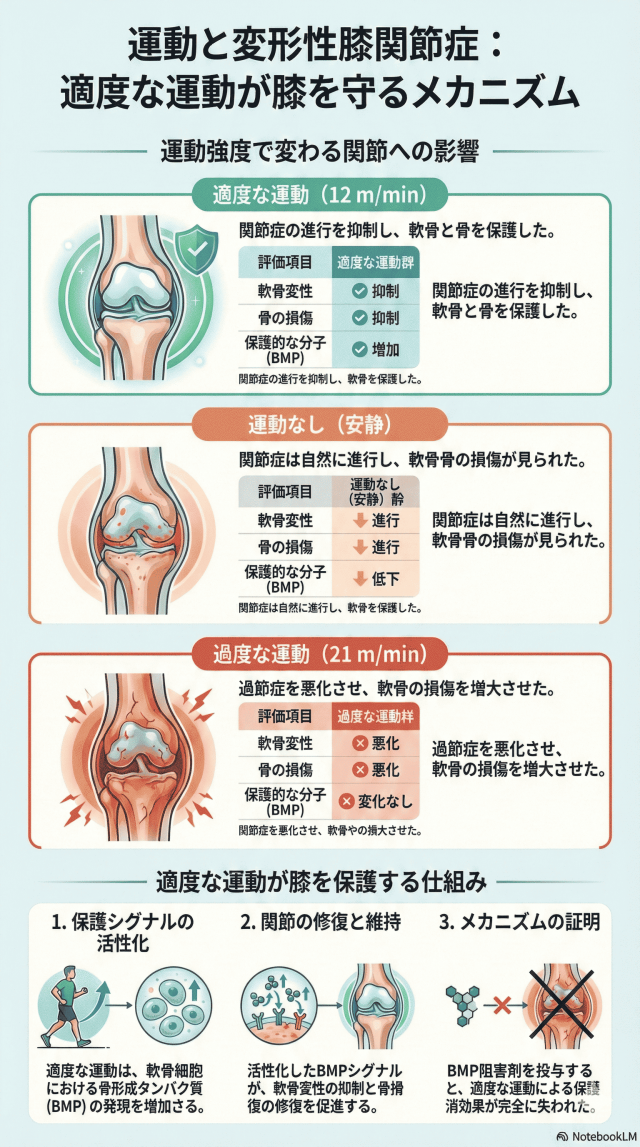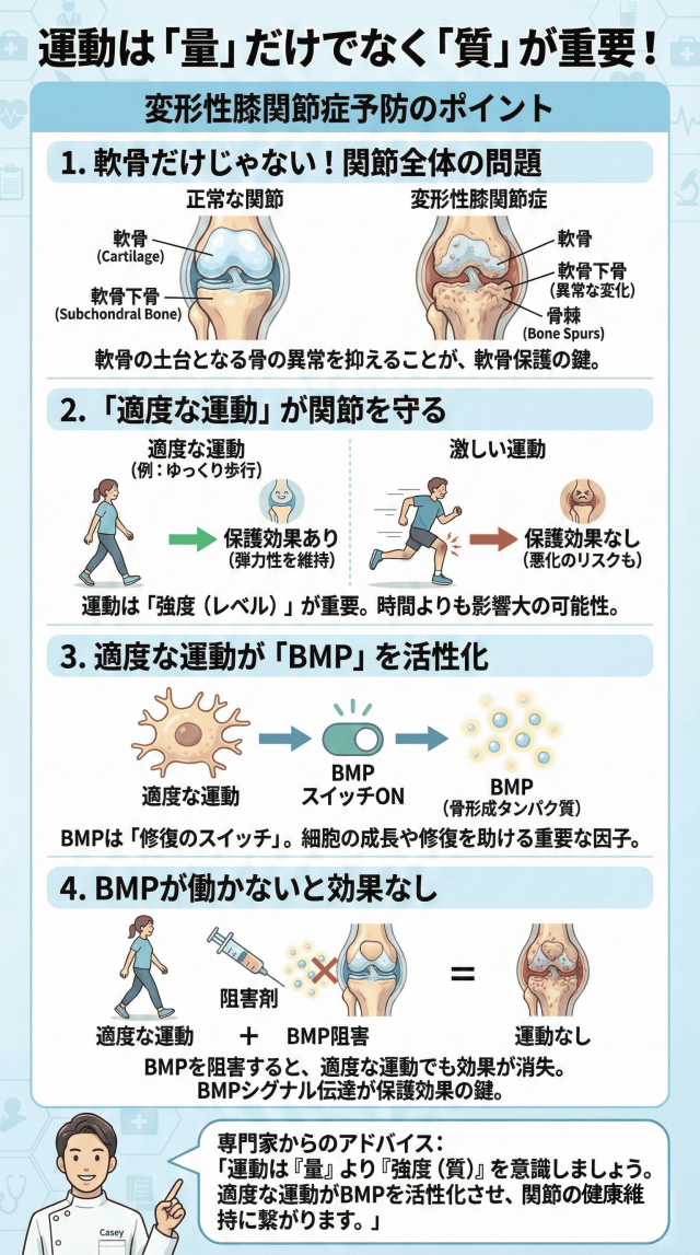 この最新の研究から、適度な運動が体内のBMPという特別なタンパク質の働きを促し、軟骨とその土台となる骨を一緒に守る鍵となる可能性が示されました,。これは変形性膝関節症の進行を遅らせるための有力な選択肢を示唆しています。