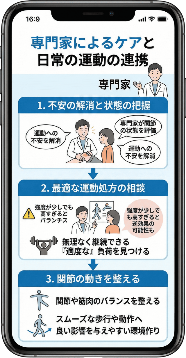 - 不安の解消と状態の把握: まず専門家に現在の関節の状態を評価してもらい、運動に対する不安を取り除くことが大切です。