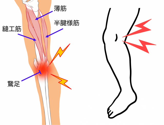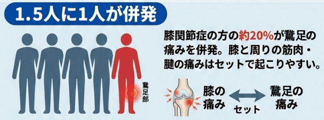 変形性膝関節症の患者さんのうち、約20%が鵞足部の痛みや炎症(鵞足炎)を抱えていると推定されています。つまり膝の関節自体の痛みと、その周りの筋肉や腱の痛みはセットで起こりやすいのです。