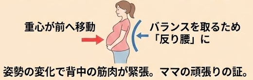 妊娠が進むとお腹(子宮)が大きくなり、体の重心が前に移動します。そのままでは前に倒れてしまうため、体は無意識のうちに背骨のカーブを強め、**「腰を反らせる(腰椎前湾の増強)」**ことでバランスを取ろうとします。