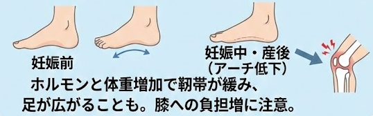 さらに重要なのは、この足の変化が**「膝」にも影響を与える**という点です。足のアーチが潰れて内側に倒れ込む(過回内)と、連動してスネの骨が内側にねじれ、膝への負担が増加する可能性があります。 特に初めての妊娠ではこの変化が大きく出る傾向があり、産後も足の形状変化が一部残るケースがあることが報告されています。