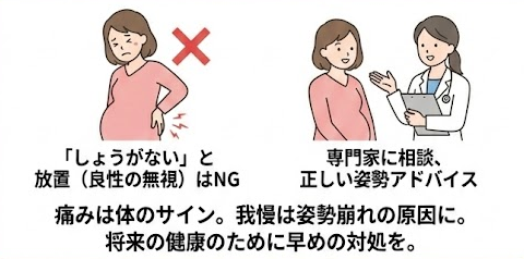 腰痛や骨盤の痛みは、体が急激な変化に耐えているサインです。我慢しすぎると無意識に姿勢が崩れ、他の関節に負担がかかることもあります。「いつか治る」と思わず、専門家に相談して筋肉の緊張を和らげたり、正しい姿勢のアドバイスを受けたりすることが、将来的な健康維持につながります。