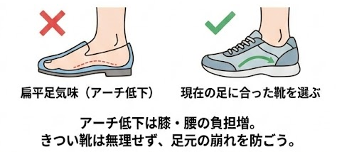 「以前の靴がきつい」と感じたら、無理に履き続けず、現在の足の形に合った靴を選び直すことが大切です。足元の崩れを防ぎ、膝や骨盤への連鎖的な負担を軽減できる可能性があります。