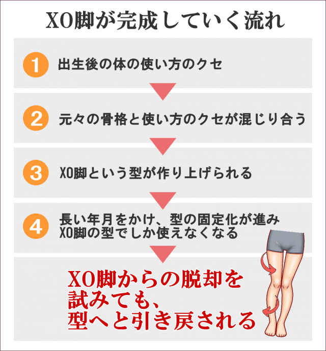 そこまで進むと、XO脚の型から抜け出そうとしても、型に引き戻されてしまいます。結果として、このXO脚は治らないのではないかと感じるようになります。