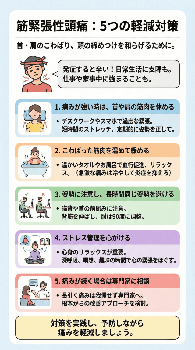 これらの対策を実践し、筋緊張性頭痛の発症を予防しながら、痛みを少しでも軽減するように心がけましょう。
