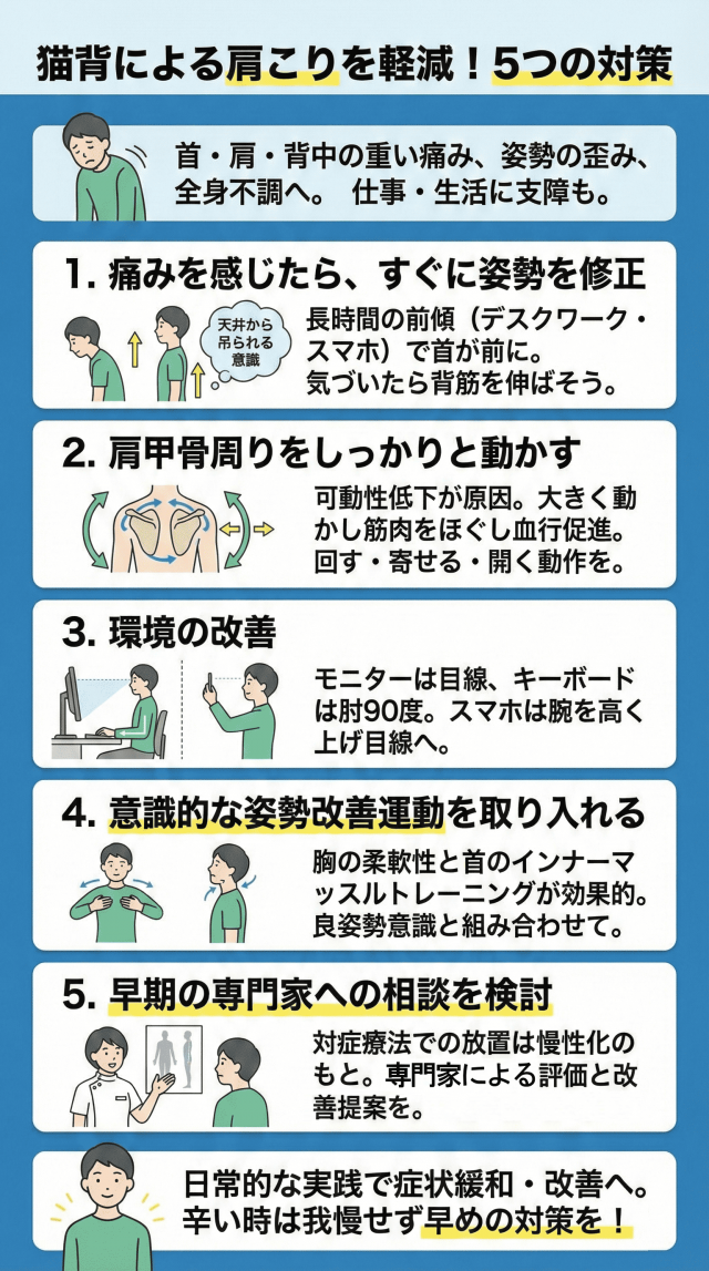 これら対策を日常的に実践することで、猫背による肩こりの症状を和らげ、改善に向かわせることが出来ます。特に、デスクワークが多い現代社会では、意識的な姿勢管理と修正が重要です。辛い症状を感じたら、我慢せずに早めの対策を心がけましょう。