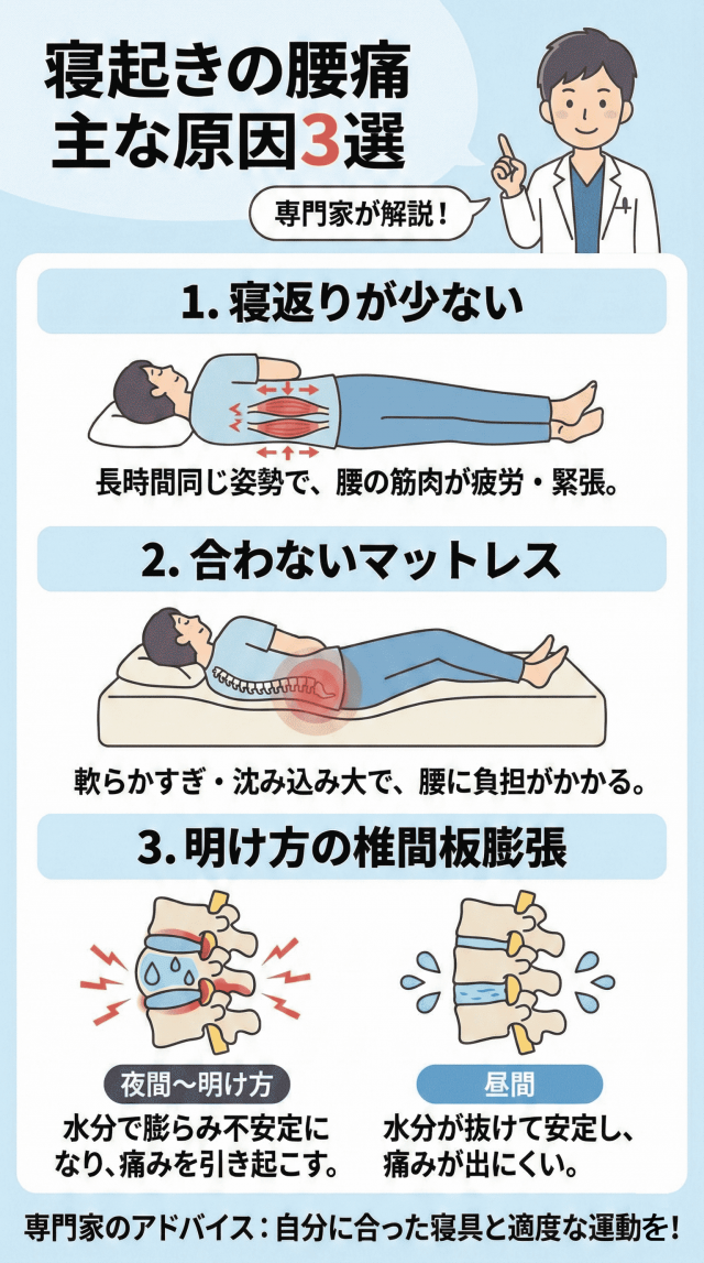 寝起きに起こる腰痛の主な原因として以下の3つがあります