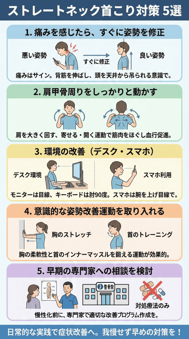 これら対策を日常的に実践することで、ストレートネックによる首こりの症状を和らげ、改善に向かわせることが出来ます。特に、デスクワークが多い現代社会では、意識的な姿勢管理と修正が重要です。辛い症状を感じたら、我慢せずに早めの対策を心がけましょう。